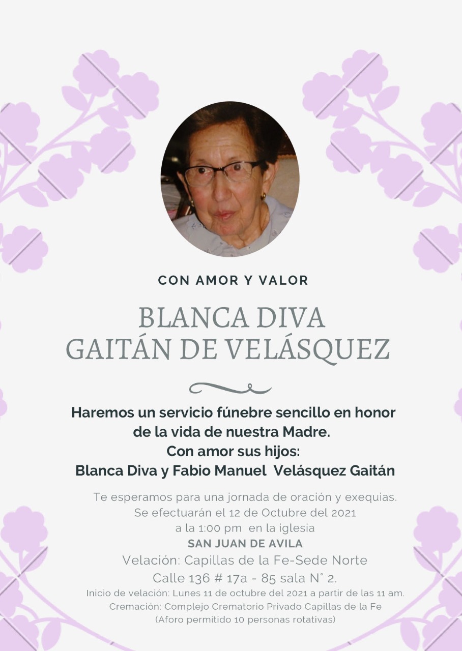 Caldas, lamenta la partida de la señora Blanca Diva Gaitán de Velásquez,