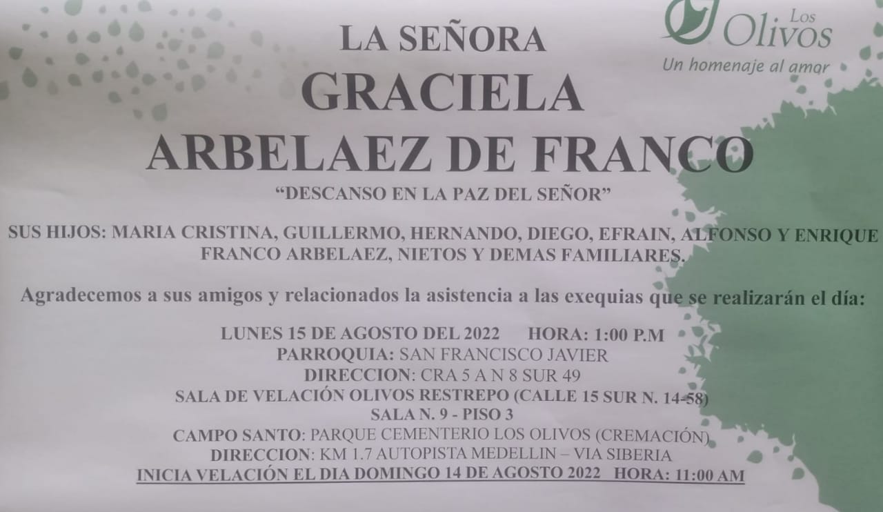 Lamentamos informar el fallecimiento de la señora Graciela Arbeláez de