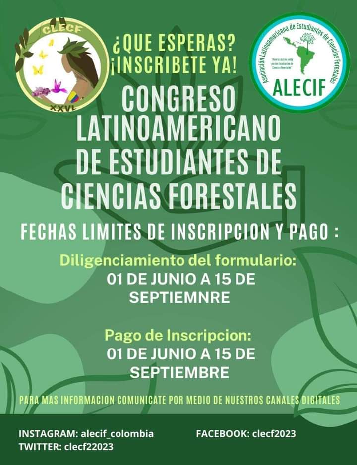 Desde el programa de Ingeniería Forestal de la Universidad Industrial de Santander, queremos reiterar la invitación a todos los estudiantes de Ingeniería forestal y disciplinas afines, al XXVI Congreso Latinoamericano de Estudiantes de Ciencias Forestales - CLECF 2023 que se realizará desde el 16 al 21 de octubre de 2023 en Málaga, Santander.