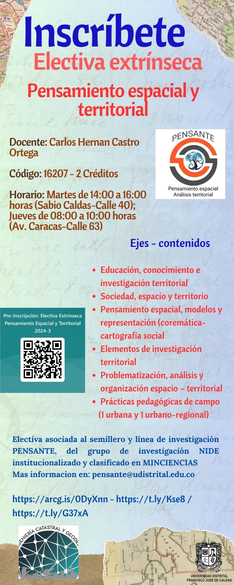 El programa de Ingeniería Catastral y Geodesia, de la facultad de ingeniería de la Universidad Distrital, ofrece para el periodo académico 2024 - 3, la electiva extrínseca “PENsamiento Espacial y Territorial-PENSANTE”; dirigida para estudiantes de cualquier programa en general de la Universidad Distrital.