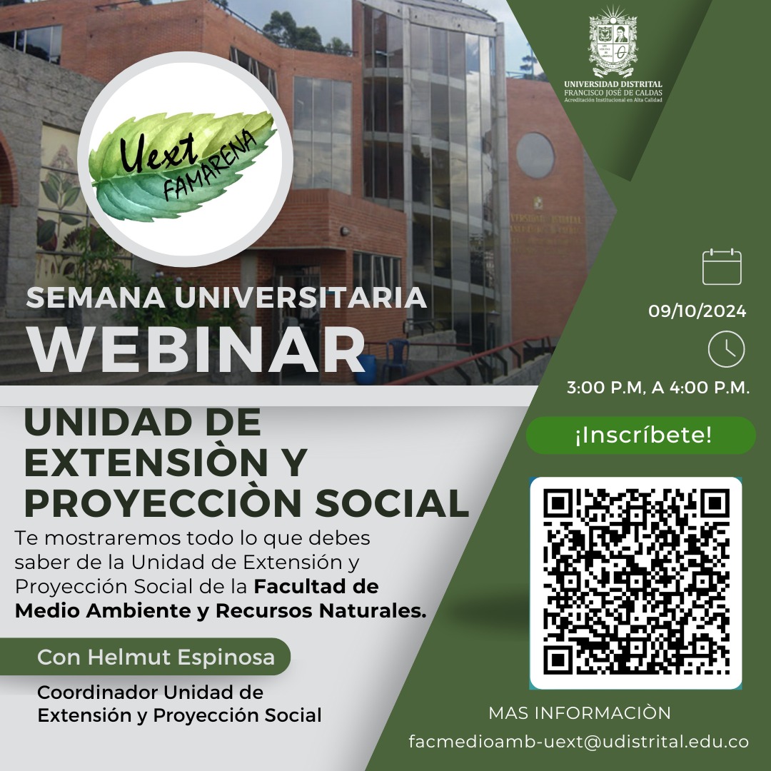 De manera atenta por medio del presente me permito remitir a usted la invitación a participar del WEBINAR SOBRE EXTENSIÓN Y PROYECCIÓN DE LA FACULTAD DEL MEDIO AMBIENTE Y RECURSOS NATURALES que se desarrollara el 9 de octubre de 2024 a través de Microsoft Times a las 3:00 p.m., el cual tendrà como fin de dar a conocer la gestion y actividades que desarrolla la Facultad del Medio Ambiente y Recursos Naturales en Extensión y Proyección Social, solicitamos amablemente divulgar por todos los medio con la comunidad para que participen de este evento programado en la Semana Universitaria.