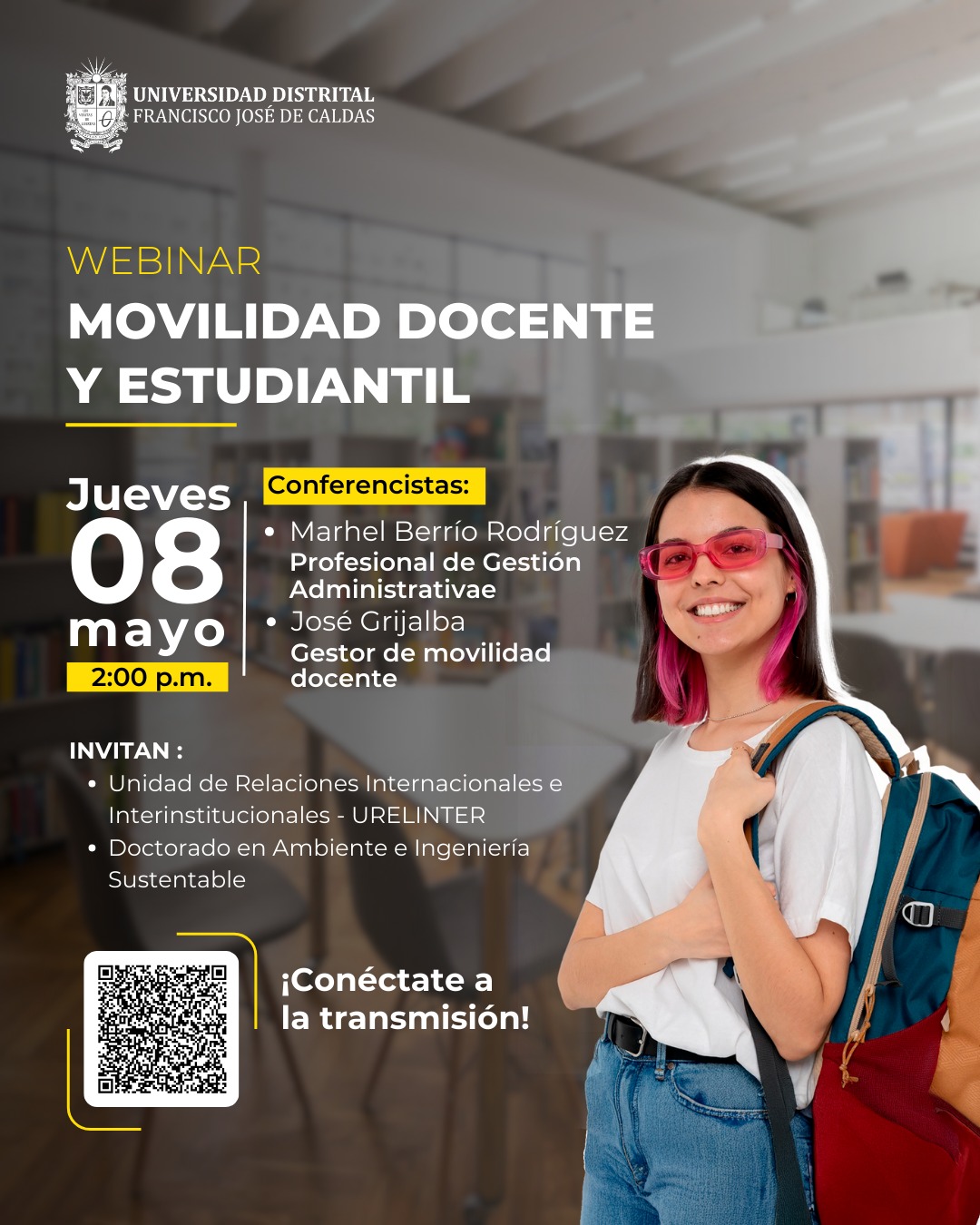 Reciban un cordial saludo. Por medio de la presente me permito invitarlos y solicitarles hacer extensiva esta invitación a sus docentes y estudiantes, sobre el Webinar que organiza el Doctorado en Ambiente e Ingeniería Sustentable y la Unidad de Relaciones Internacionales e Interinstitucionales URELINTER sobre Movilidad docente y estudiantil en la Universidad Distrital, que se llevará a cabo el día jueves 08 de mayo de 2025 a las 2:00 PM. Consideramos que dicho espacio puede contribuir de manera significativa al promover la movilidad entrante y saliente en cada uno de nuestros proyectos curriculares en pro de mejorar la visibilidad nacional e internacional de nuestra Facultad (Adjuntamos pieza gráfica con toda la información).